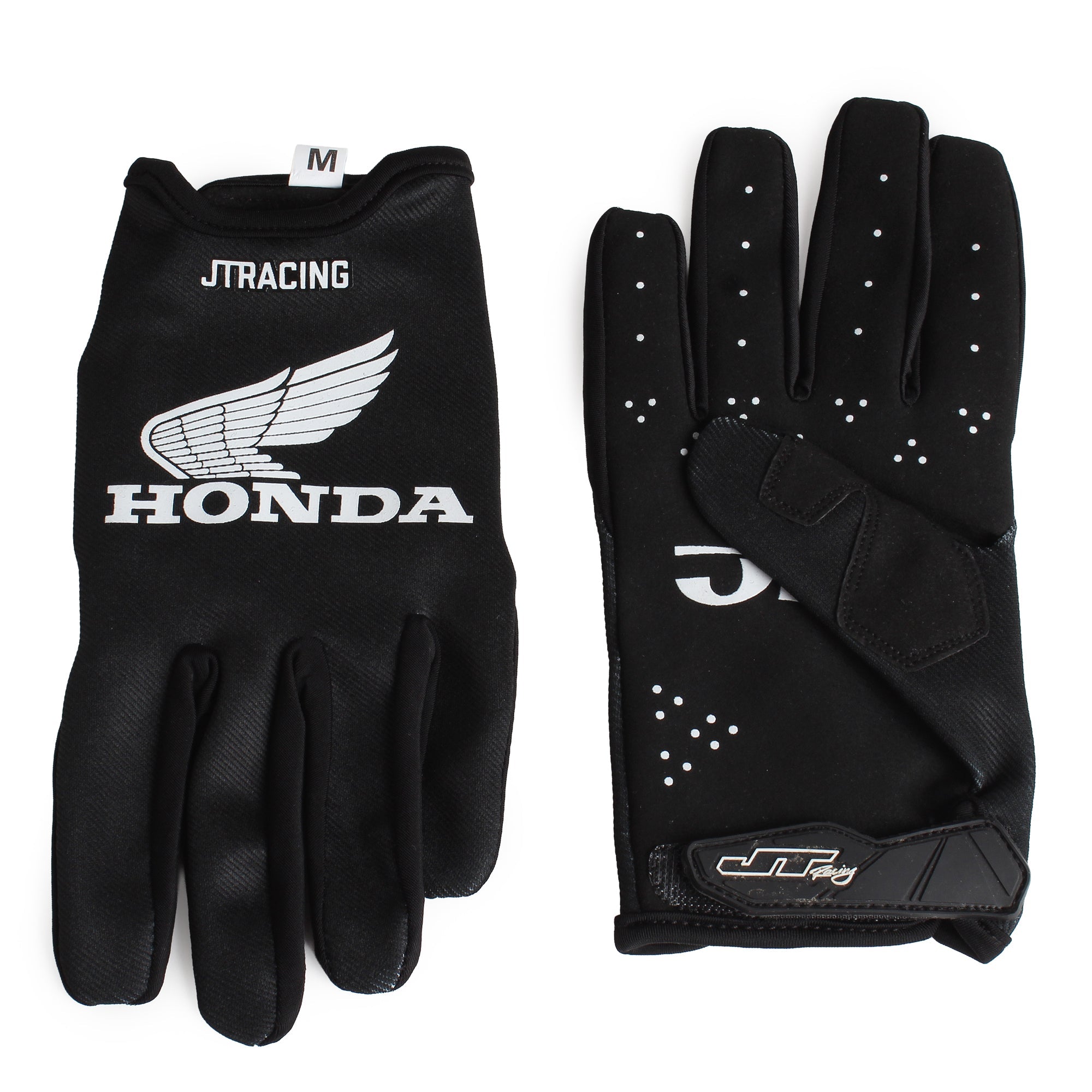 Pro-Lite racing gloves, black with JT x Honda branding.