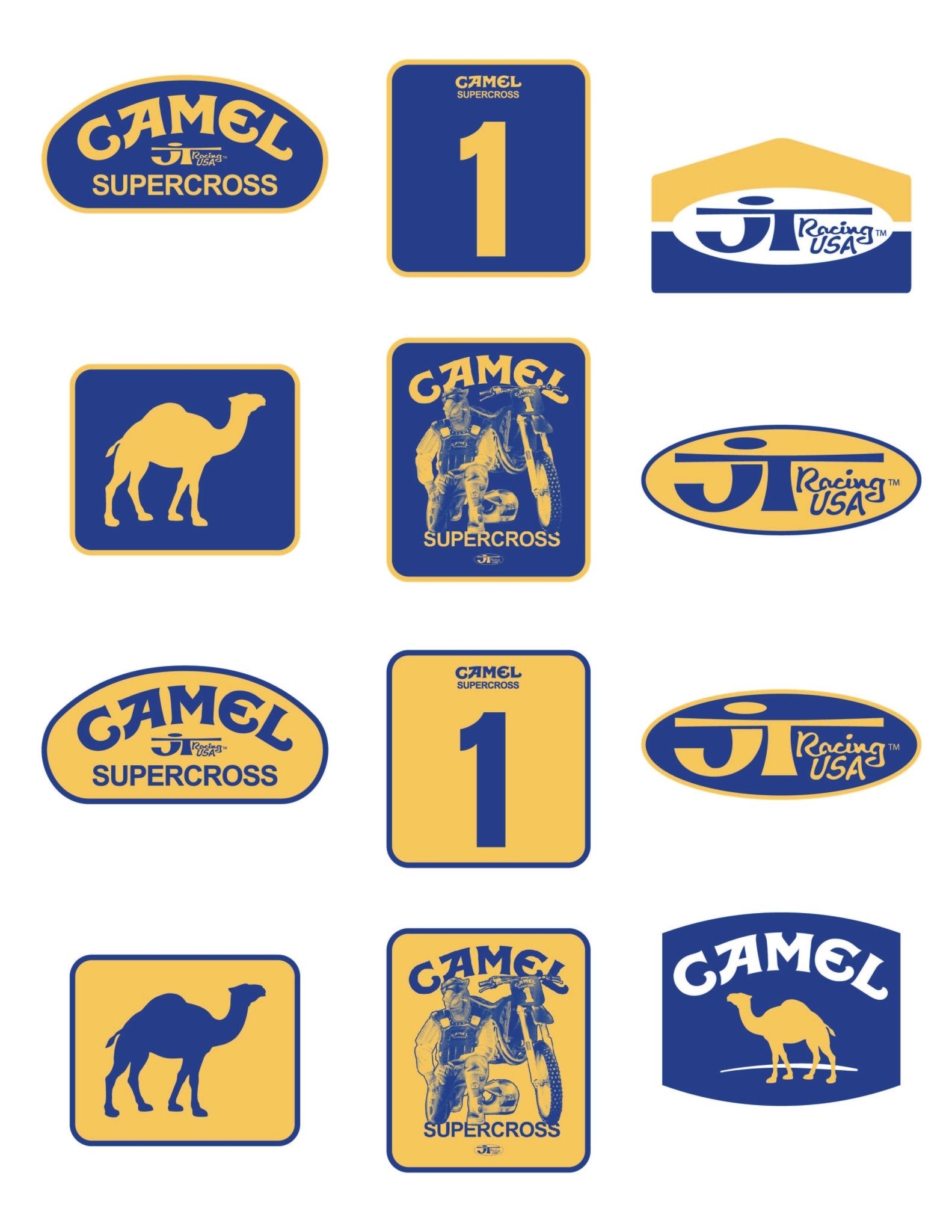 Multiple Variations of the classic Camel and JT Racing USA logos.